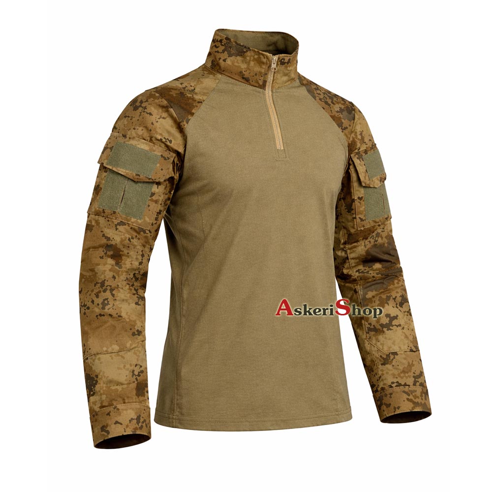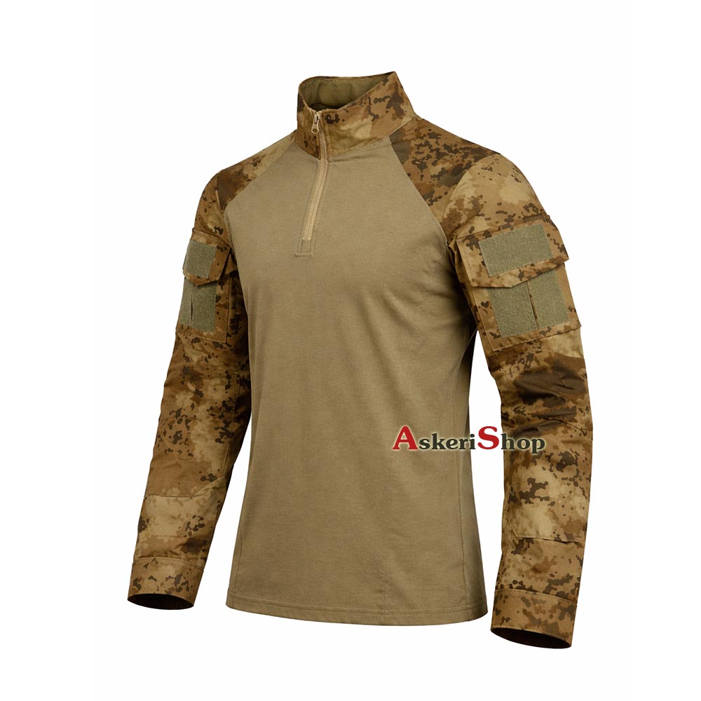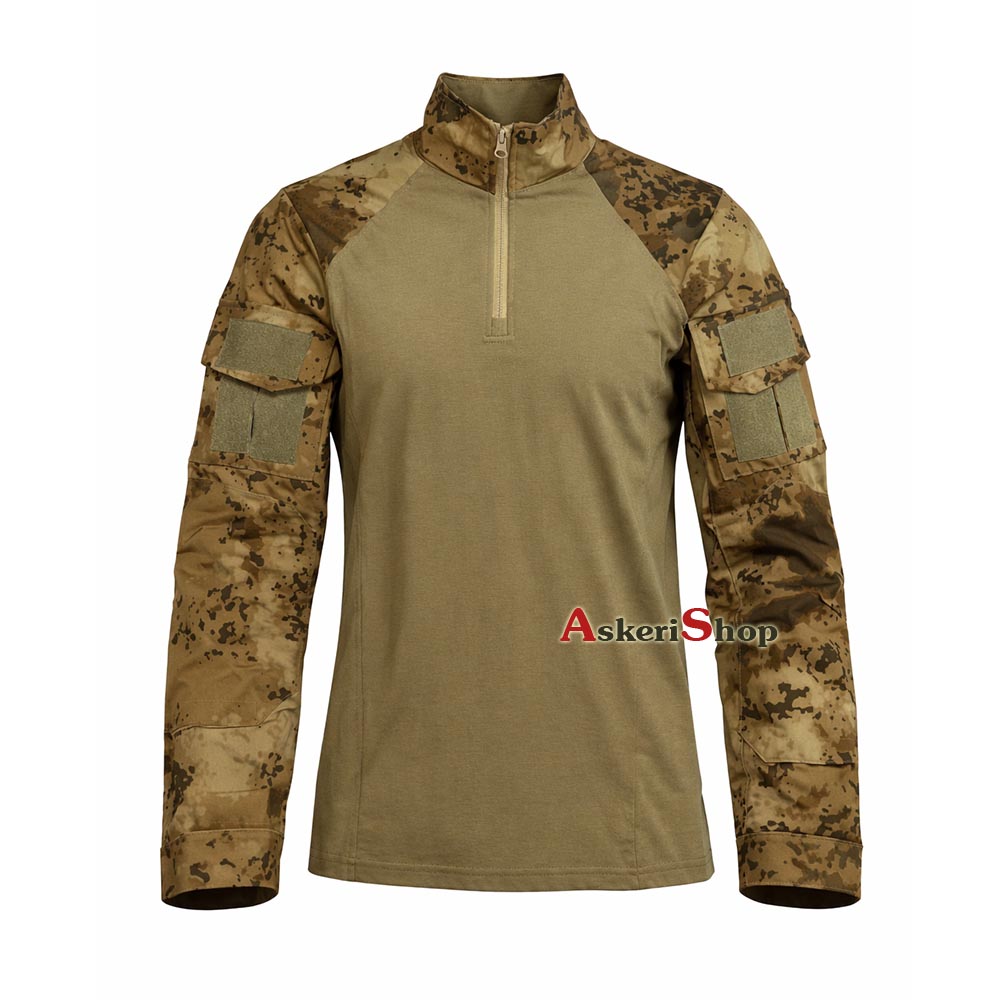 Bu taktik combat tişört, kamuflaj bölgelerinde yüksek esneklik ve aşınma direnci sunan likra kumaş, gövde kısmında ise üstün nefes alabilirlik sağlayan pike kumaş ile üretilmiştir. Ergonomik kesimi sayesinde tam hareket kabiliyeti sunar, uzun süreli operasyonlarda ter yönetimini optimize eder. Dayanıklı yapısı ve fonksiyonel tasarımıyla askeri kullanım, taktik görevler ve zorlu saha koşulları için uygundur.